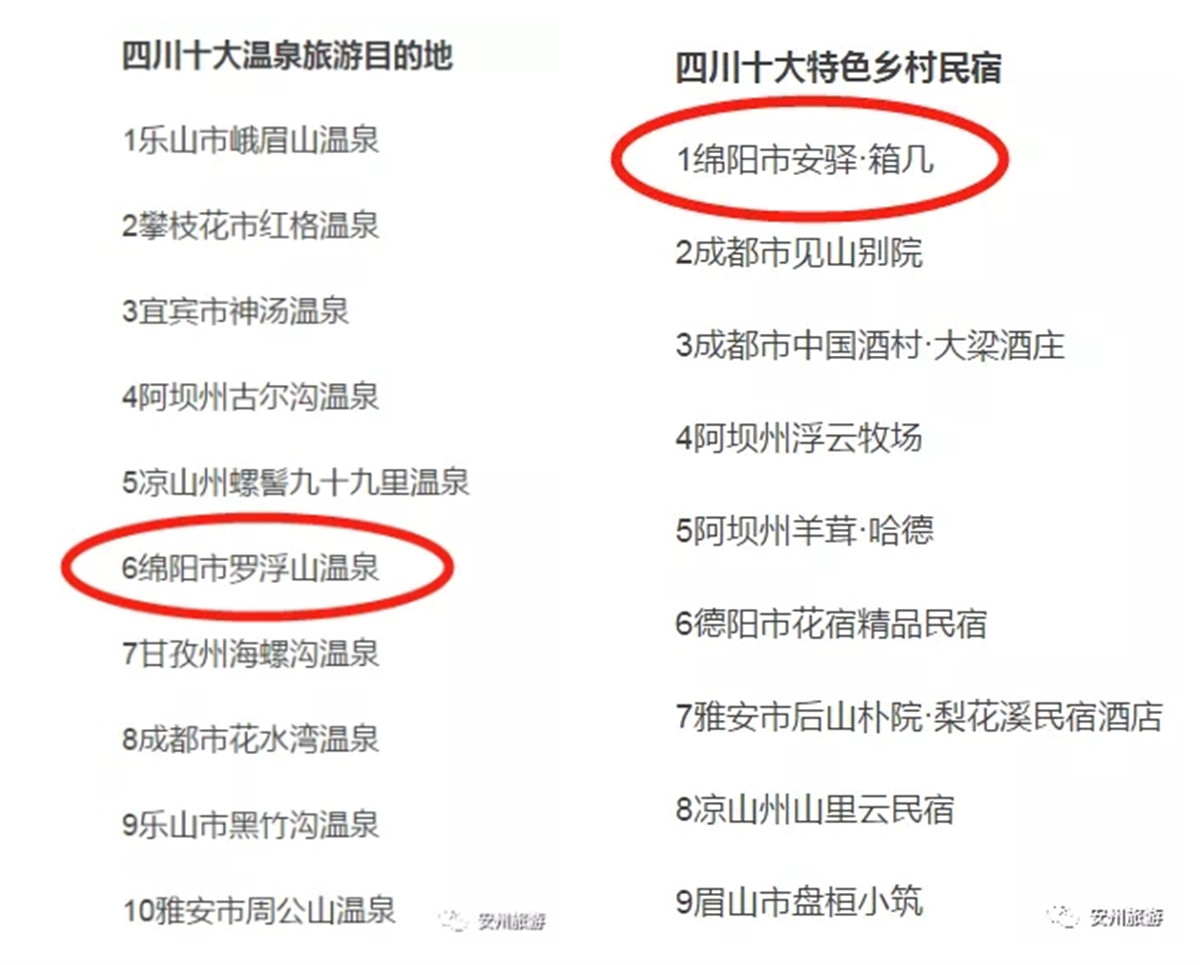 其中,我们安州的罗浮山温泉以及沸水镇枫香村的安驿·箱几均榜上有名。