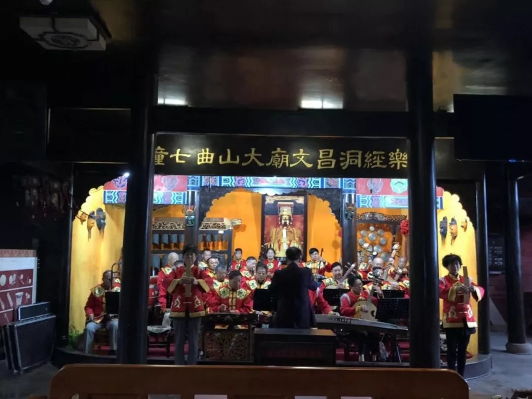 作为文昌帝乡,梓潼七曲山大庙是谈演《文昌大洞仙经》的当然之所。中国洞经古乐发源于此亦为学界公论。清朝咸丰年间的《梓潼县志》有记载:明清以来,梓潼每年二月三日的文昌圣诞之期,都要在七曲山大庙举行洞经音乐谈演,这些都说明这里是中国音乐活化石之称的洞经音乐的发祥地。