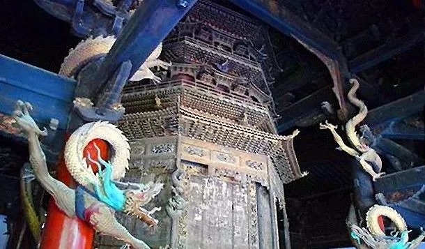 每层雕有执笏人物,形神自如,体态潇洒,衣纹流畅,木柱及额枋上均施沥粉彩绘,为全国保存最为完好、历史最为久远的道教飞天藏。