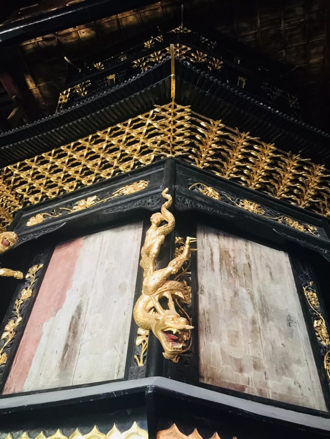 车高九点八二米,直径七米,上下共四层,上雕塑有天宫楼阁,腰檐上装饰有斗拱,