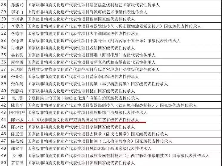 近日,由绵阳市非遗中心推荐的省级代表性传承人陈云珍成功入选2019“中国非遗年度人物”100人候选名单。此次活动由文化和旅游部非遗司指导,光明日报社、光明网主办。100名候选人中有传承人79人,策展人、企业家、艺术家7人,管理者4人,研究者、媒体人、传播者(含团队)10人。