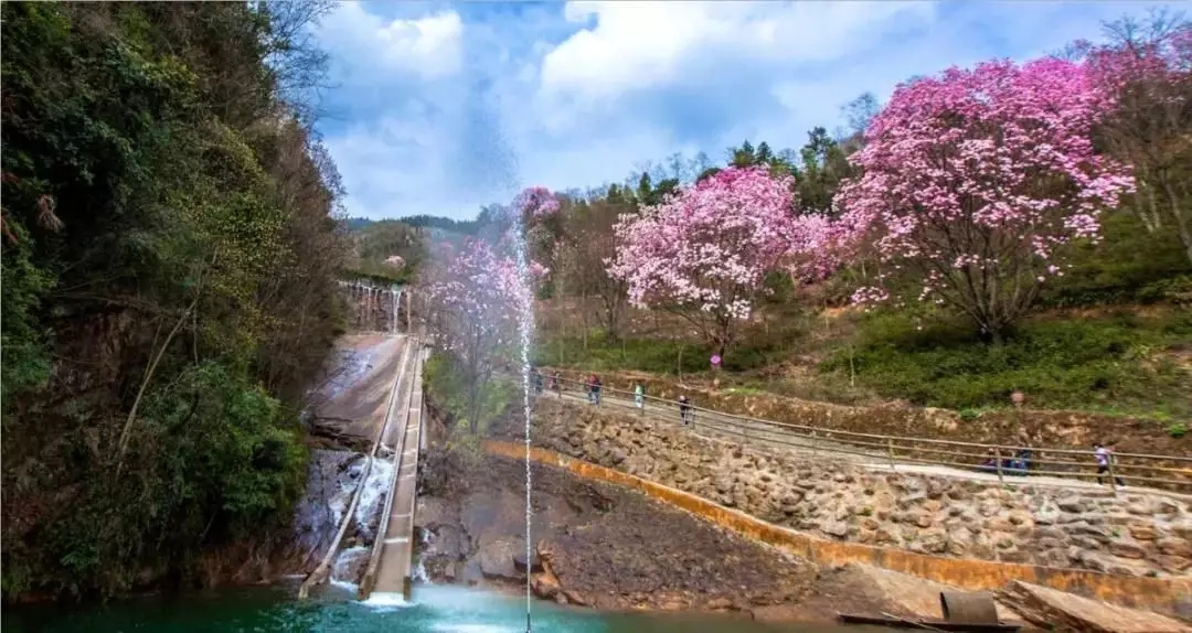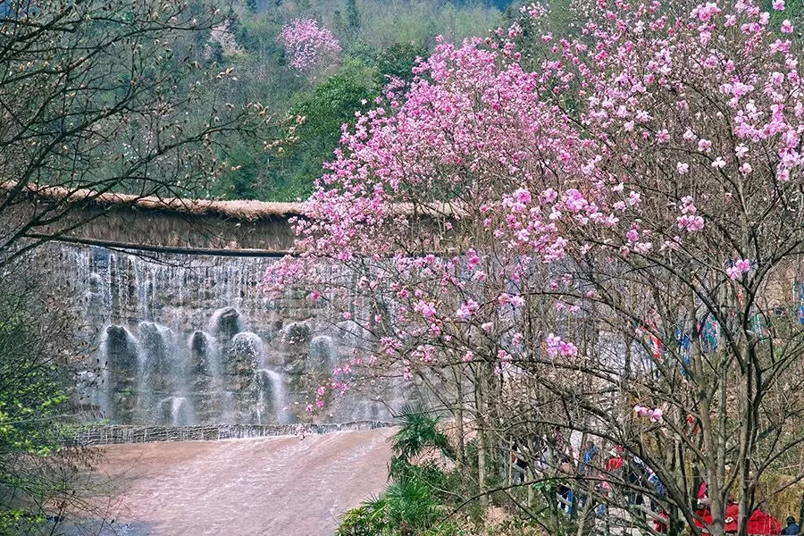 山腰处的天河飞瀑,更是必来的打卡点,与两旁生长的百年辛夷相得益彰,形成了独具观赏性的花溪景。