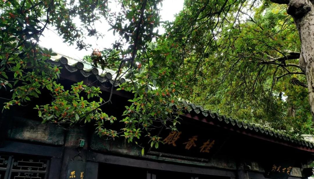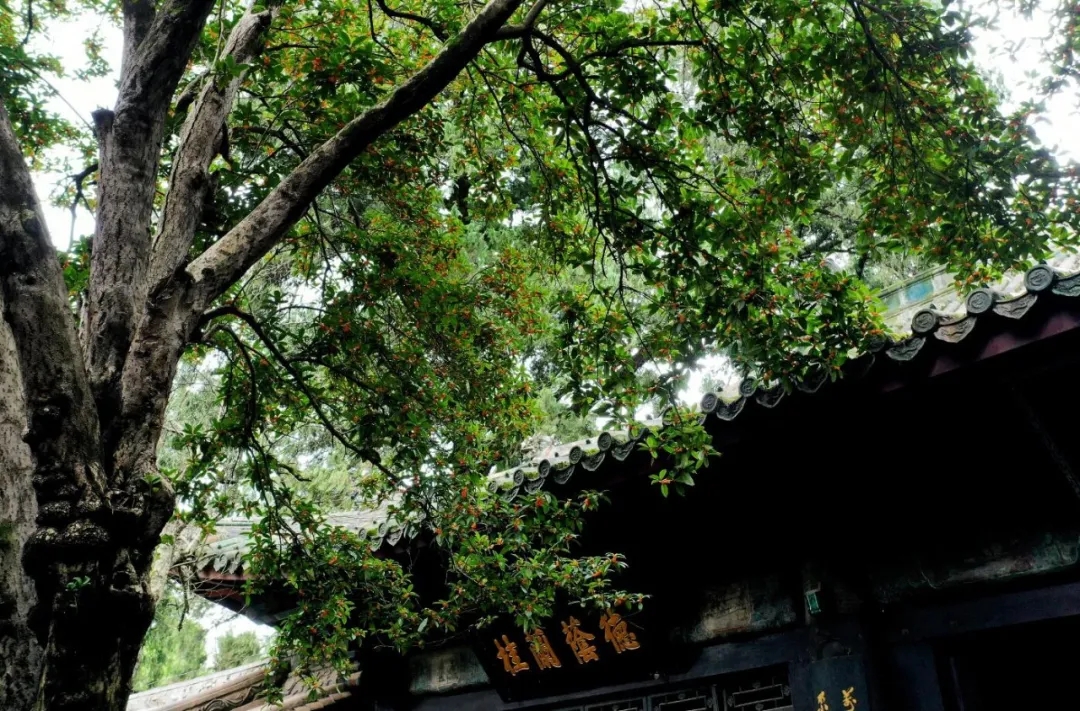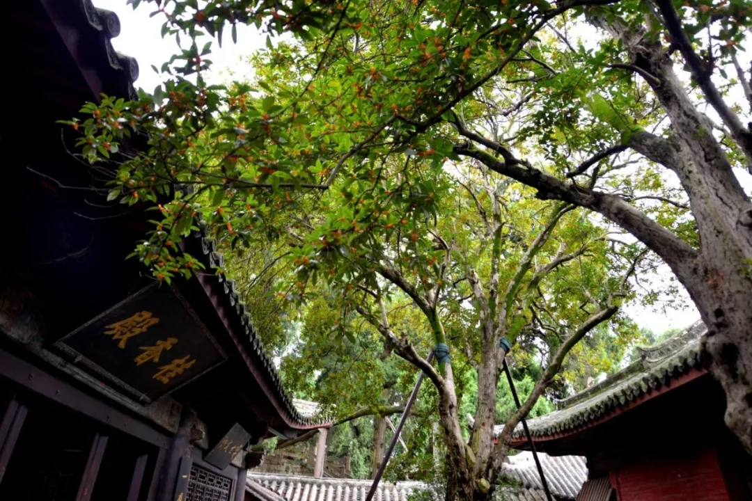 桂香殿殿前的丹桂是非常稀有的橘红色丹桂品种,为明朝所种,虽然只有四棵,