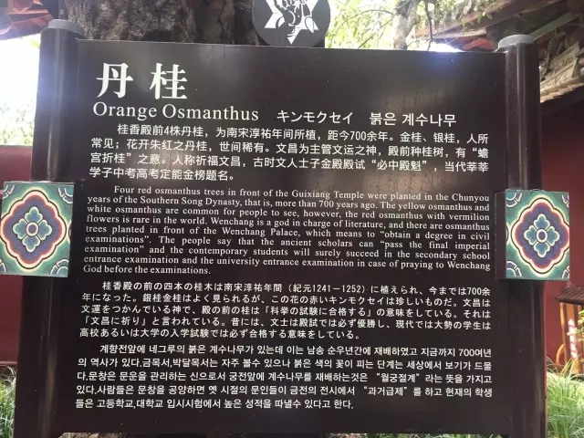 金桂、银桂人所常见;花开朱红之丹桂,世间稀有。文昌为主管文运之神,殿前所种桂树,