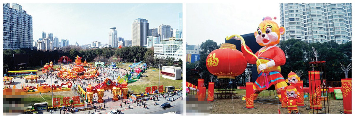 沿文化广场涪城路大门行至喷泉处,道路两侧以“中国梦、百姓梦”、“中华美德”、“梦想飞扬”、“践行价值观、传递正能量”等为主题灯组展示区已基本布置完成,吸引了许多路过市民拍照留念。在喷泉一侧,8米多高的猴王手持直径5米的灯笼造型极其抢眼,不少市民驻足称奇,“好家伙,真是高”。