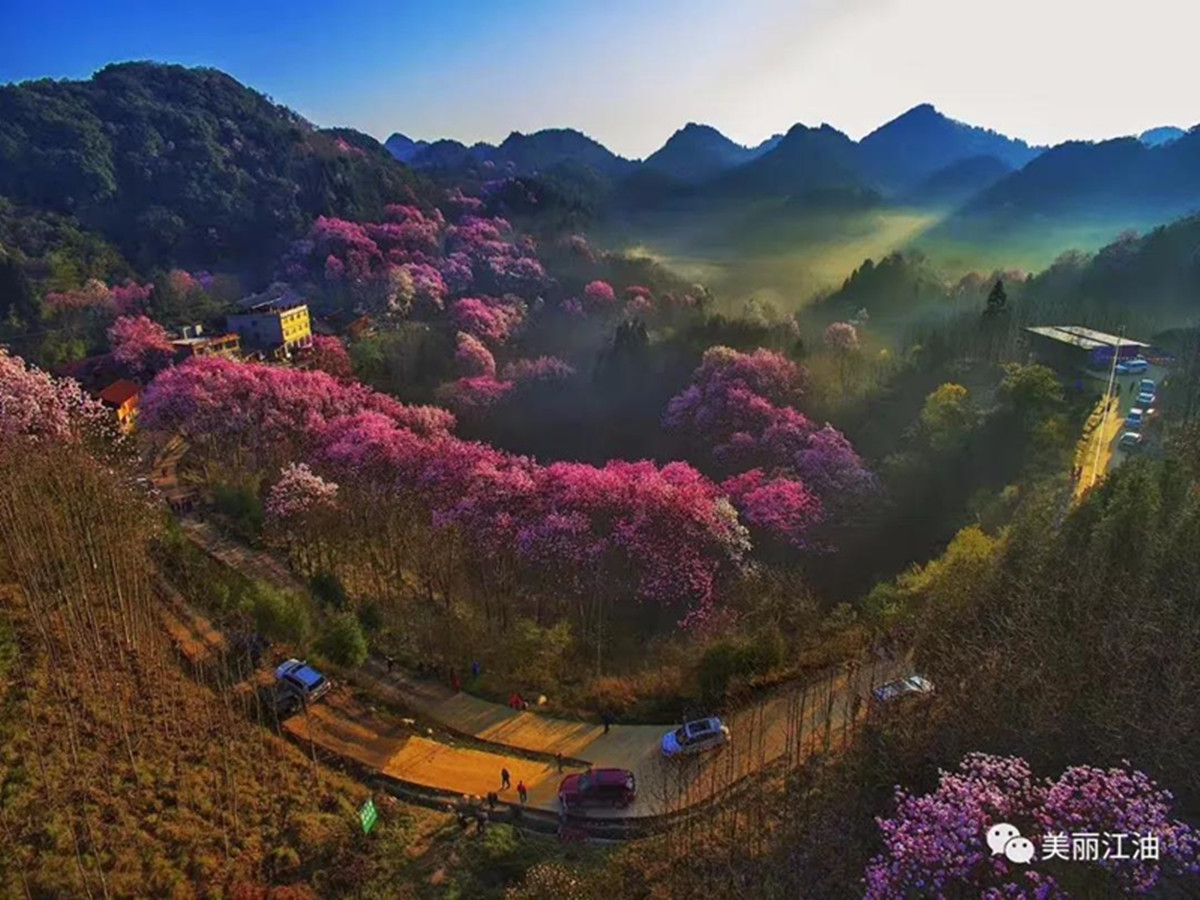 万亩辛夷花次第绽放,万花成海、依山成势,颜色由白到粉、由粉到紫,漫山遍野姹紫嫣红、如烟似霞,赢得游客一片赞叹。