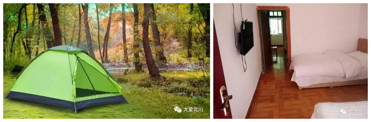 景区内可以露营,租赁帐篷或者自带均可,也可以入住景区外的农家乐,消费不贵,大约40元一个人。