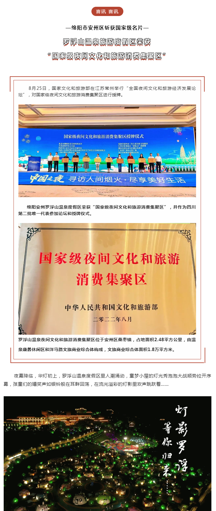 下一条:重磅!绵阳安州罗浮山温泉度假区荣获“国家级夜间文化和旅游消费集聚区”